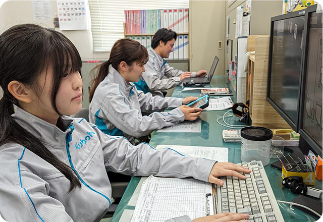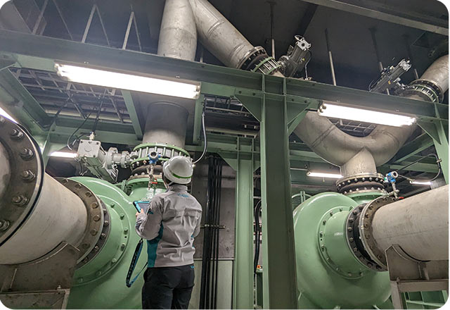 当社の運転管理業務は、パソコンやタブレットで行う業務、水質分析業務、点検業務、施設全体の監視業務、装置のメンテナンス業務など多岐に渡ります。